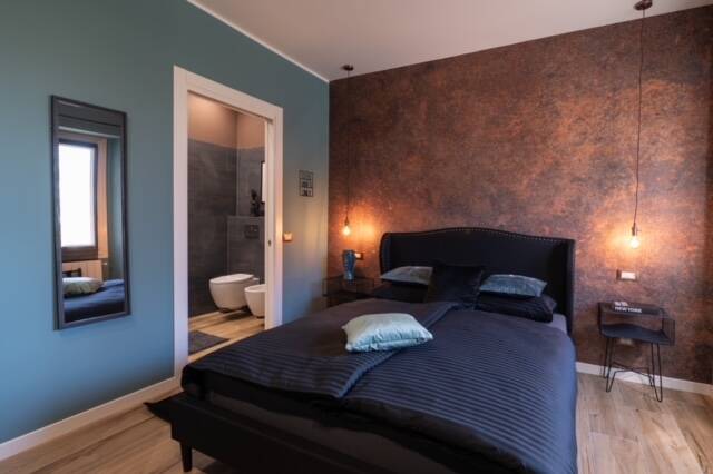 Un design alternativo caratterizzato da una palette di tonalità scure crea un’atmosfera intima e avvolgente. Le pareti, dipinte in profondi toni di blu, nero e bronzo, si combinano armoniosamente con dettagli in metallo e legno, aggiungendo un tocco industriale elegante e sofisticato. Mon Bryan è la scelta perfetta per chi desidera un’esperienza unica e ricercata, dove il design e l’originalità si fondono per offrire un soggiorno davvero esclusivo.